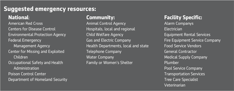 联系合适的应急资源来协助清理,修复、持续的管理危机。bob电子体育竞猜你的危机应对设备应该包含这些资源列表,联系人的名字和他们的办公室和紧急电话号码。bob电子体育竞猜为了您的方便,我们准备了应急资源的列表并提供电话号码等国家资源的美国红十字会、美国疾病控制中心,联邦应急管理局。bob电子体育竞猜